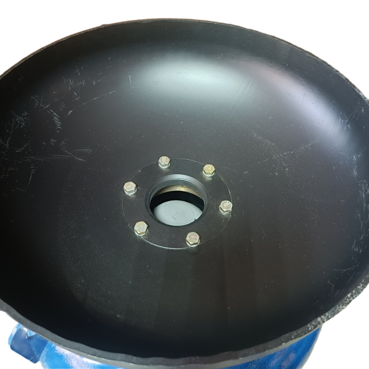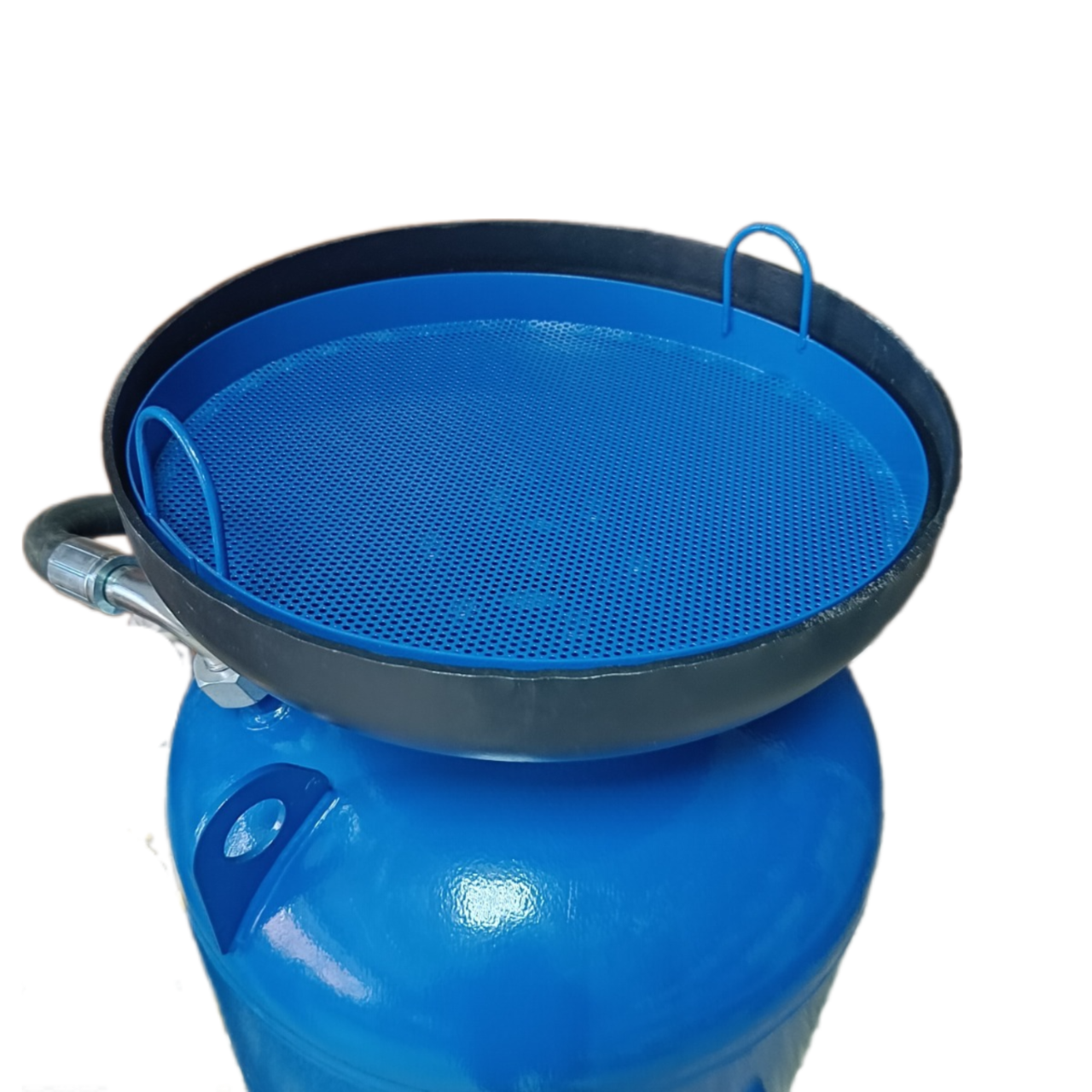 Вершина конуса, образующего нижнюю часть ресивера, снабжена горловиной, к которой крепится дозатор абразива.