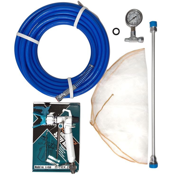 Комплектность: Аппарат, Манометр с тройником, Всасывающая система в сборе, Шланг ВД (15м), Окрасочный пистолет с соплодержателем, Сопло (517), Удлинитель 0.5м, Сетка для процеживания краски.