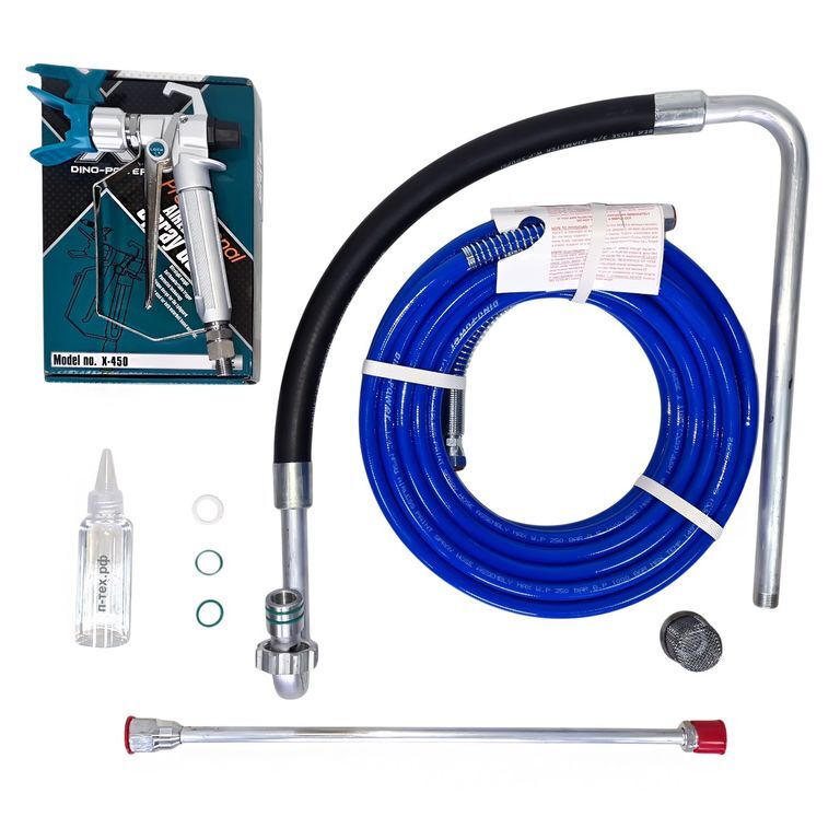 Комплектность: Аппарат окрасочный в сборе, Шланг высокого давления - 15 м, Окрасочный пистолет распылитель с соплодержателем, Реверсивное окрасочное сопло - 517, Удочка удлинитель - 0.5 м, Масло разделительное для смазки поршневых уплотнений.