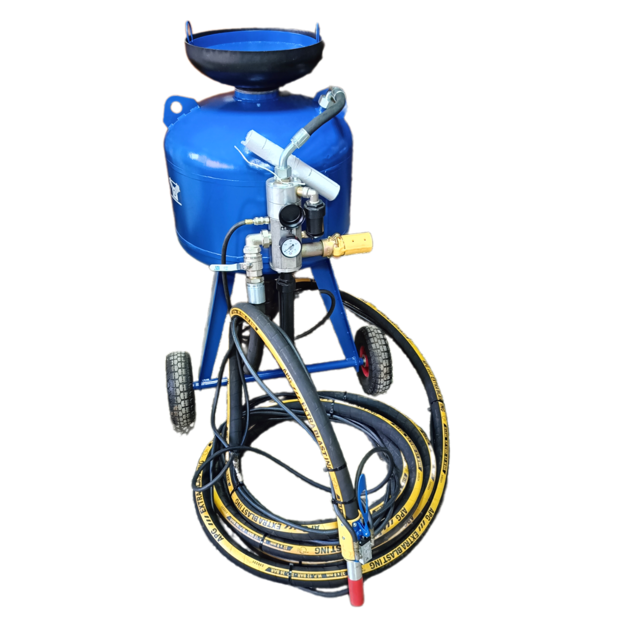 Сжатый воздух проходит в Y-образный патрубок дозатора, где смешивается с абразивом, поступающим через дозатор из ресивера. По напорному рукаву абразив с воздухом поступает в соплодержатель и через сопло подаётся на обрабатываемую поверхность.