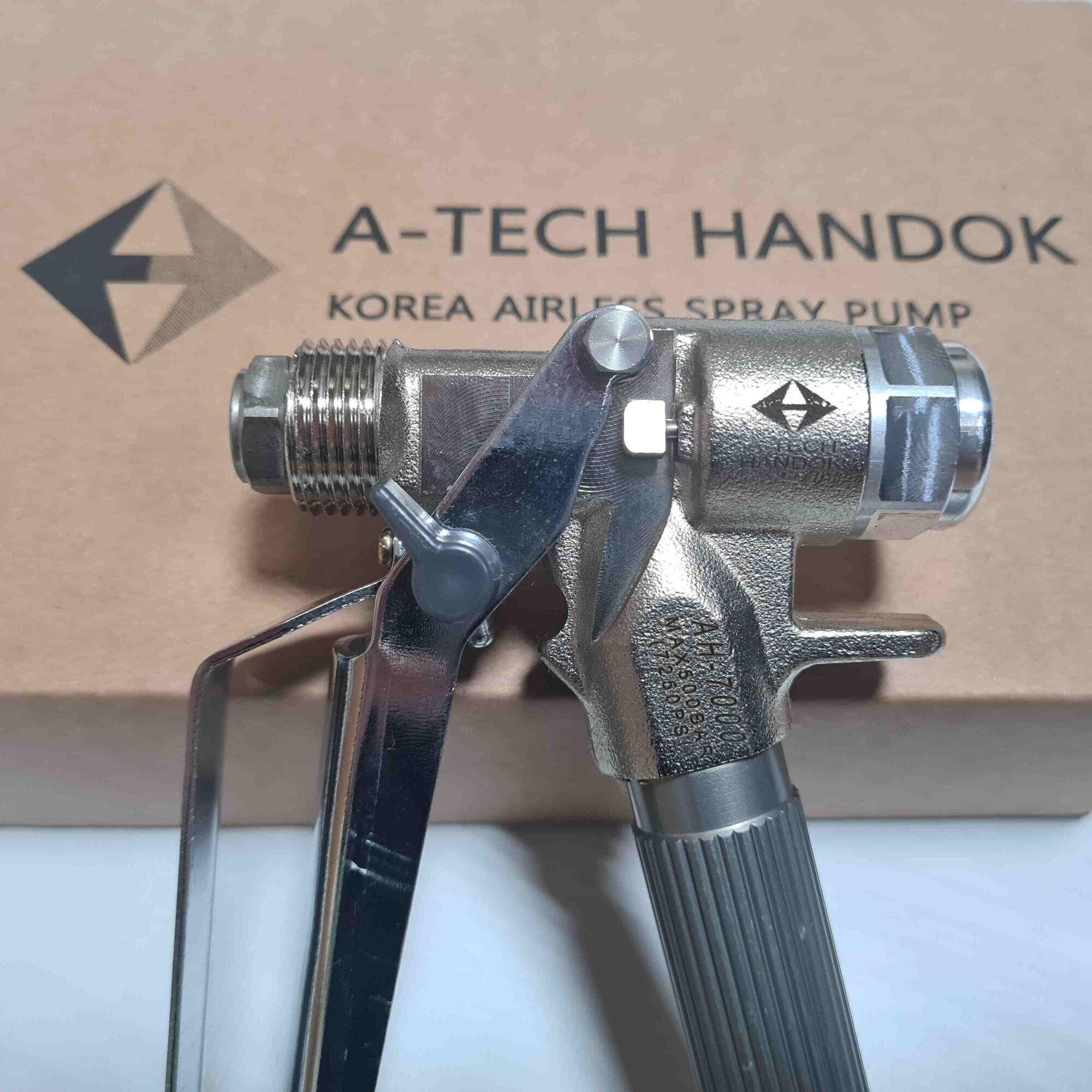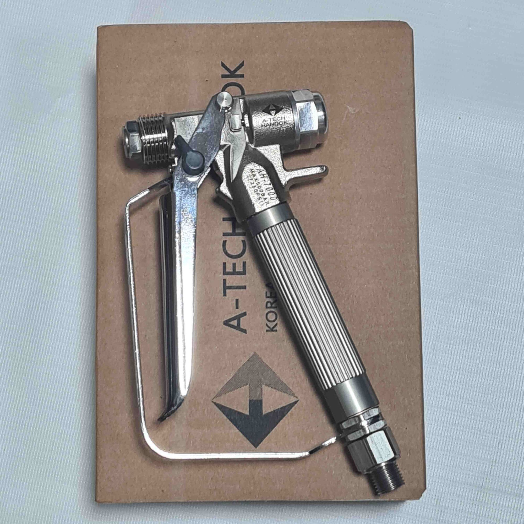 Высококачественный пистолет-распылитель AH-5000 от южнокорейской компании Handok для современных аппаратов безвоздушного распыления. Этот безвоздушный краскопульт является клоном широко известного Graco XTR-5. Рабочее давление до 500 бар.