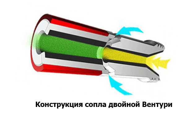 Сопла с двойным каналом Вентури имеют две секции, размещенные последовательно в одном корпусе.